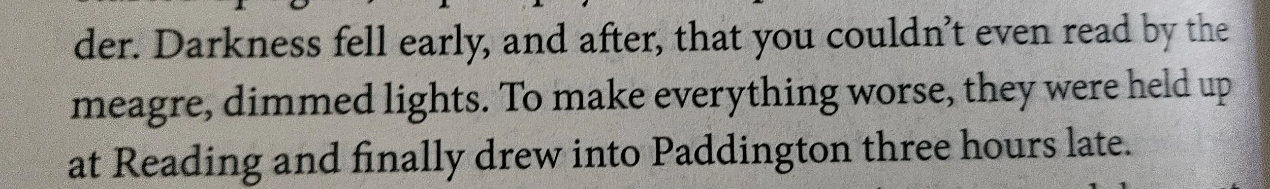 In the next paragraph, the new-to-me word “chuntered” appeared in the following sentence: “The taxi chuntered down the dark, semi-deserted streets, and the rain poured down and it was still piercingly cold.” Merriam-Webster.com gives “mutter” as a synonym for “chunter,” so it’s used literarily, not literally, here. I would have followed M-W, which lists “semi” as a prefix not requiring a hyphen in most cases, and made it “semideserted.” I also would have inserted a comma after “down” because of the new subject “it” that follows.